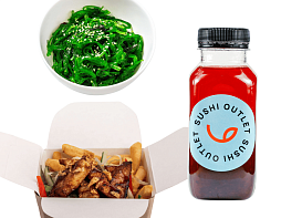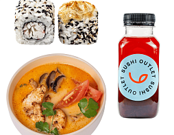 Акция: пн-чт, 10:00-16:00. Том ям с курицей (330 гр), ролл Сансей (8 шт), морс клюква 250 мл.